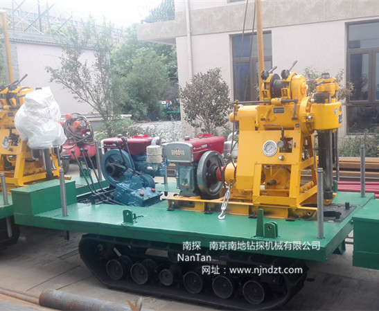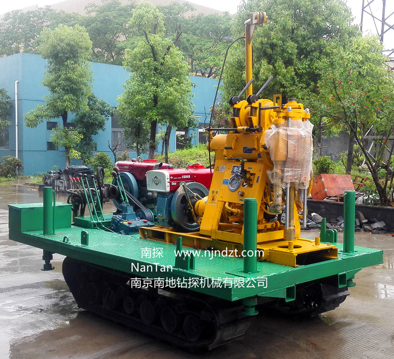 一、簡(jiǎn)介 XY-1-L-01-A(B)型履帶鉆機(jī)及人字形四角架鉆塔,是將橡膠履帶底盤(pán)、動(dòng)力(柴油機(jī)或電機(jī))、鉆機(jī)、A型為4組手動(dòng)支撐腿B型為4組液壓支撐腿、鉆機(jī)平臺(tái)、6米高人字形四角架起落鉆塔、水泵等共同組裝在一個(gè)機(jī)架上。鉆機(jī)、水泵一個(gè)動(dòng)力(柴油機(jī)或電機(jī)),橡膠履帶底盤(pán)一個(gè)動(dòng)力(柴油機(jī)或電機(jī))帶動(dòng),互不干擾。該機(jī)型具有爬坡能力強(qiáng)、鉆進(jìn)和行走穩(wěn)定可靠、載重質(zhì)量大等優(yōu)點(diǎn),適用于地質(zhì)、冶金、煤炭、水文、建筑工程、水電工程、公路、鐵路、港口、城建、橋梁、壩基等建筑物的工程地質(zhì)勘察、淺層探礦、礦山坑道、水井、小型灌漿孔、爆破孔等的鉆進(jìn)。該鉆機(jī)是適應(yīng)新型市場(chǎng)需求不可多得的理想設(shè)備之一。可在海灘、河灘、沙地、水田等惡劣環(huán)境開(kāi)展靜探作業(yè),結(jié)冰道路仍可行走。