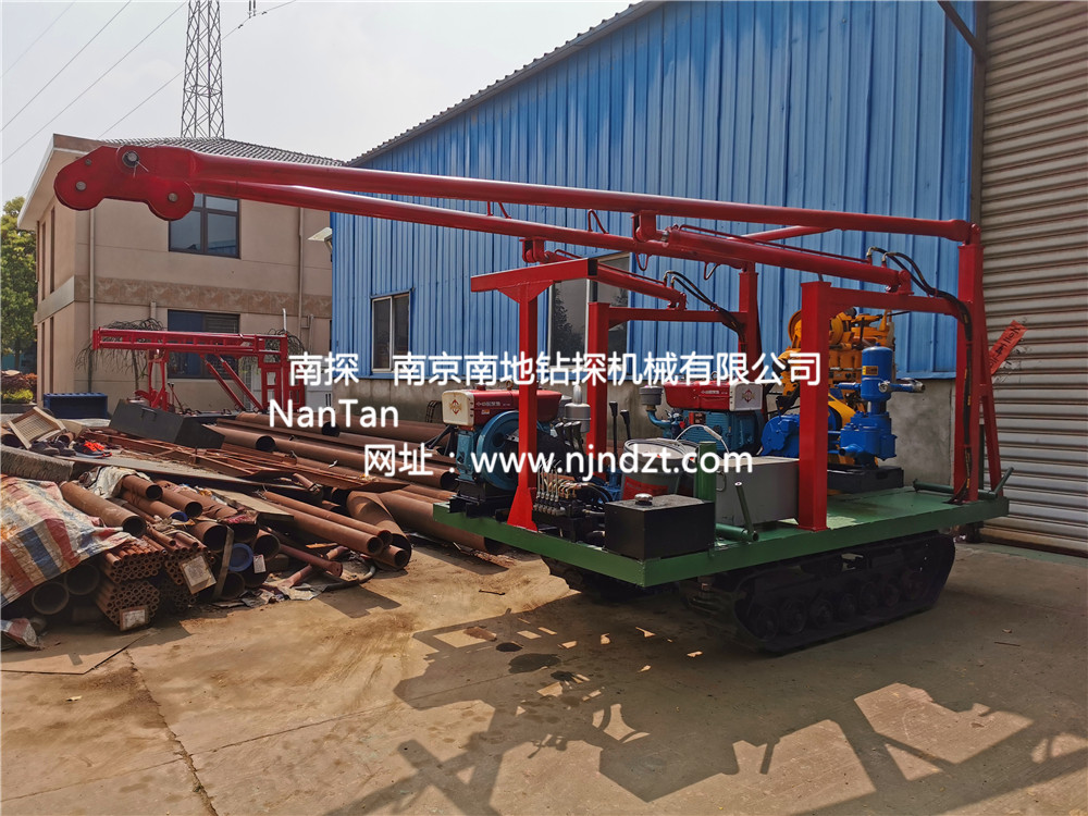 4、鉆機、泥漿泵、塔架一體,搬家方便快捷,可自行上下汽車。搬家時鉆桿鉆具等一切東西均可放在履帶底盤上一次運走。