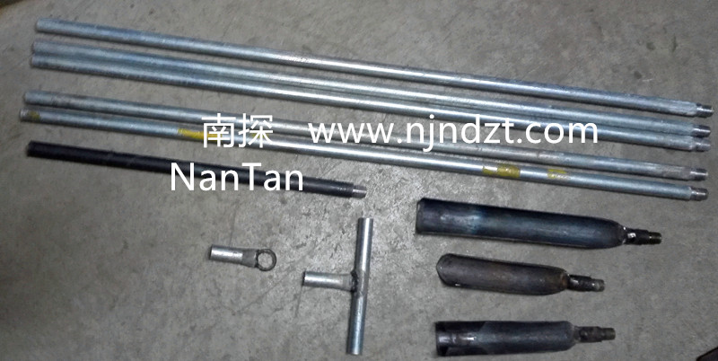 一段有柄,可以接長(zhǎng)的白蠟桿。使用時(shí)垂直向下戳擊地面,可深逾20米,利用半圓柱形的鏟可以將地下