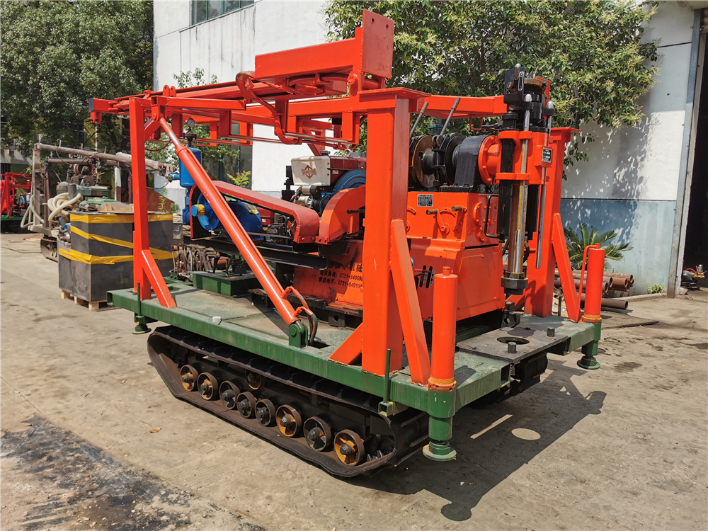 1、鉆機機組由履帶底盤、柴油機、鉆機及柴油機、龍門自動全液壓起落鉆塔(采用龍門形鉆塔,升高型液壓油缸作支撐,操縱閥控制鉆塔起落、升降,操作省時省力,安全可靠)、泥漿泵組成。