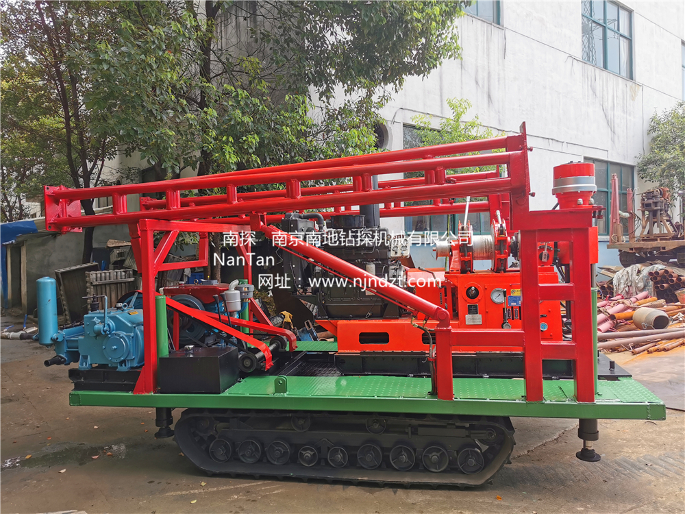 鉆機機組由履帶底盤、柴油機、升高型液壓支腿、鉆機、折疊式液壓起落鉆塔組成,共同組裝在一個機架上。鉆機可以選擇柴油機或電動機、履帶底盤及液壓支腿由獨立柴油機帶動、互不干涉。